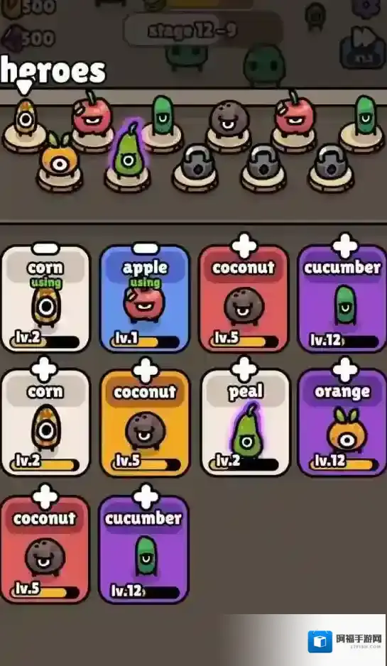2、点击下方的英雄按钮可以召唤不同的水果,召唤后你可以选择上阵或者用来强化其他水果。
