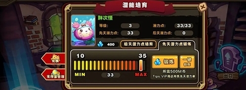 6、玩家还可以对宠物进行潜能培养,分为先天潜能和后天潜能培养,后天主要通过喂食不同品质的宠物蛋和金币获取不同的潜力经验条(c、d级普遍为20,部分c级为100),在喂养过程存在有折扣,满足一级增加一潜力点。而先天主要通过商店购买先天潜力果和钻石进行培养(成本较高)。