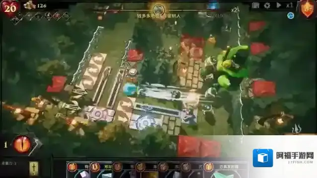 4、正式开始后怪物会从红色区域出现,并前往蓝色区域,当角色进入陷阱范围会后陷阱会自动进行攻击,消灭敌人可以获得魔眼来使用新的卡牌。